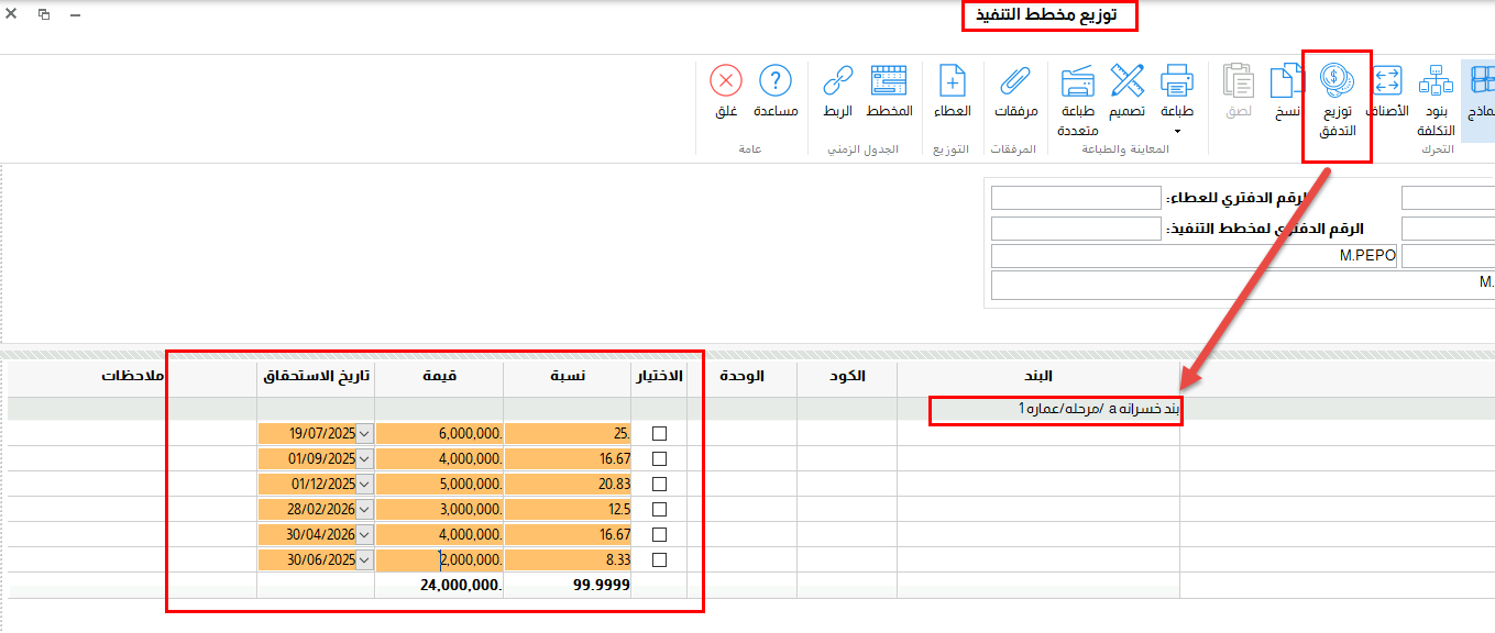 لذلك تم اذضافة امكانية تقدير هذه النفقات الخارجة المتوقعة بتواريخ استحقاقها فى شاشة توزيع مخطط التنفيذ وذلك عن طريق لادخال المنصرف المتوقع على كل بند اعمال ،كما يمكن ادخال هذه النفقات فى شكل نسبة من تكلفة البند.