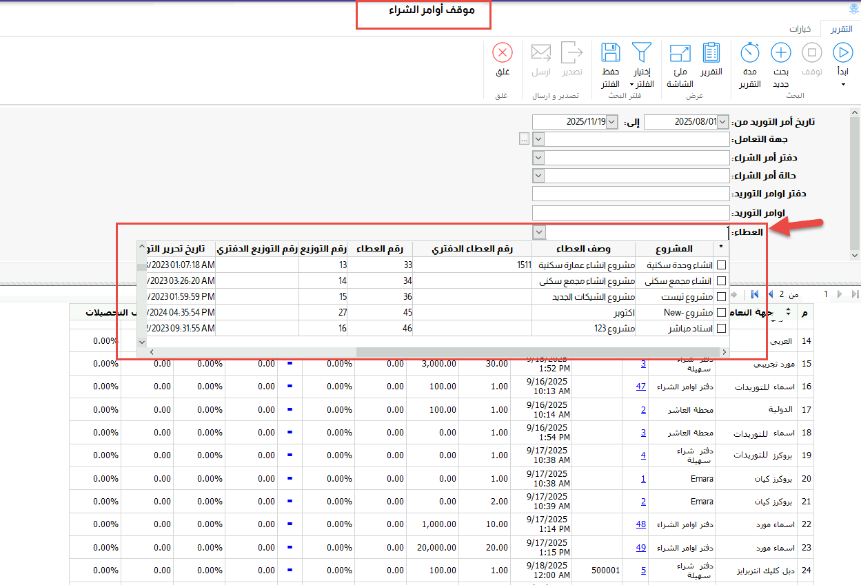 لذلك تم اضافة فلتر بالمشروع (العطاء) فى تقرير موقف اوامر الشراء ، يتم من خلاله تنقية نتائج التقرير على اوامر الشراء المرتبطة بمشروعات المقاولات سواء كانت اوامر الشراء محملة من توزيع مخطط التنفيذ مباشرة او محملة من طلب شراء محمل من توزيع مخطط التنفيذ