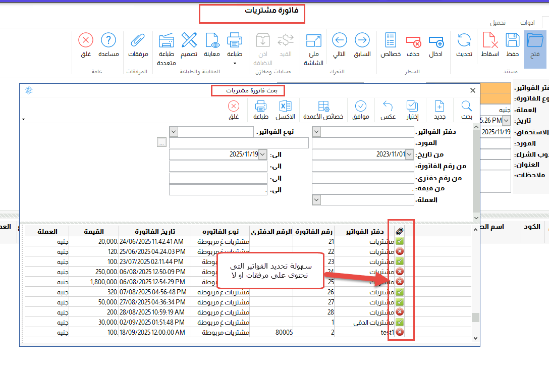 يحتاج المستخدم لحصر ومراجعة المستندات التى عليها مرفقات او التى بدون مرفقات لذلك تم اضافة عمود يوضح حالة المرفقات فى شاشة البحث عن فواتير المشتريات وذلك لتسهيل الوصول للفواتير التى بدون مرفق .