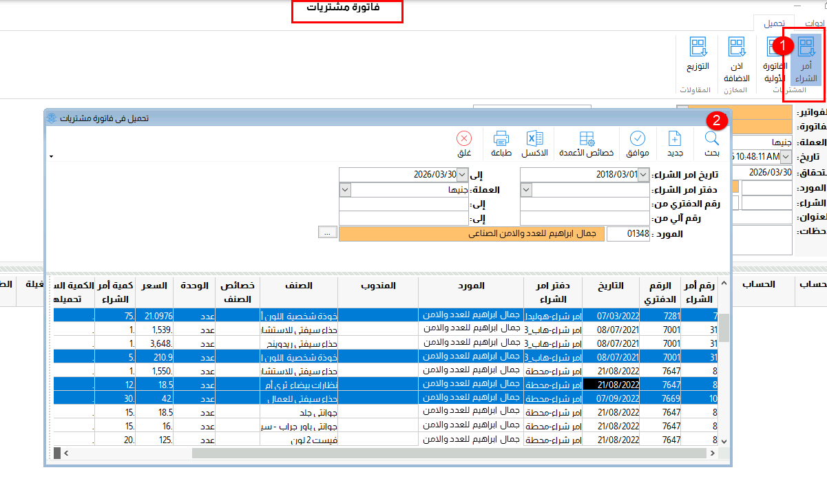 وفى بعض الاحيان يتم اصدار فاتورة مشتريات واحدة بناءً على اكثر من امر شراء ، لذلك ولتسهيل هذه العملية فقد تم اتاحة امكانية تحميل عدة اوامر شراء فى فاتورة مشتريات واحدة لنفس المورد