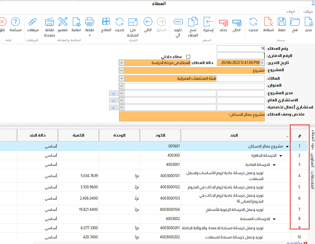 لذلك تم اضافة ميزة جديدة فى هذا الاصدار لتسهيل الوصول الى مكان الخطأ ففى حالة وجود خطأ سيقوم البرنامج بالوقوف على السطر الذى يحتوى على مشكلة مع تحديد رقم السطر وتوصيف الخطأ وذلك فى جميع شاشات المقاولات .