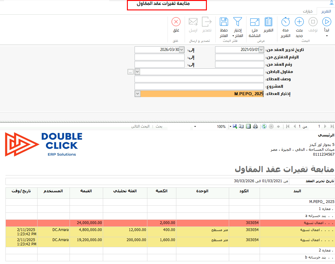 وحتى يسهل على المستخدم مراجعة ومتابعة البنود التى تم التعديل عليها ففى هذا الاصدار تم انشاء تقربر لحصر بنود الاعمال التى تم تغييرها والتغيرات التى تمت عليها سواء كانت تغييرات فى السعر او فى الكمية وكذلك يوضح المستخدم الذى قام بهذه التغييرات ووقتها .