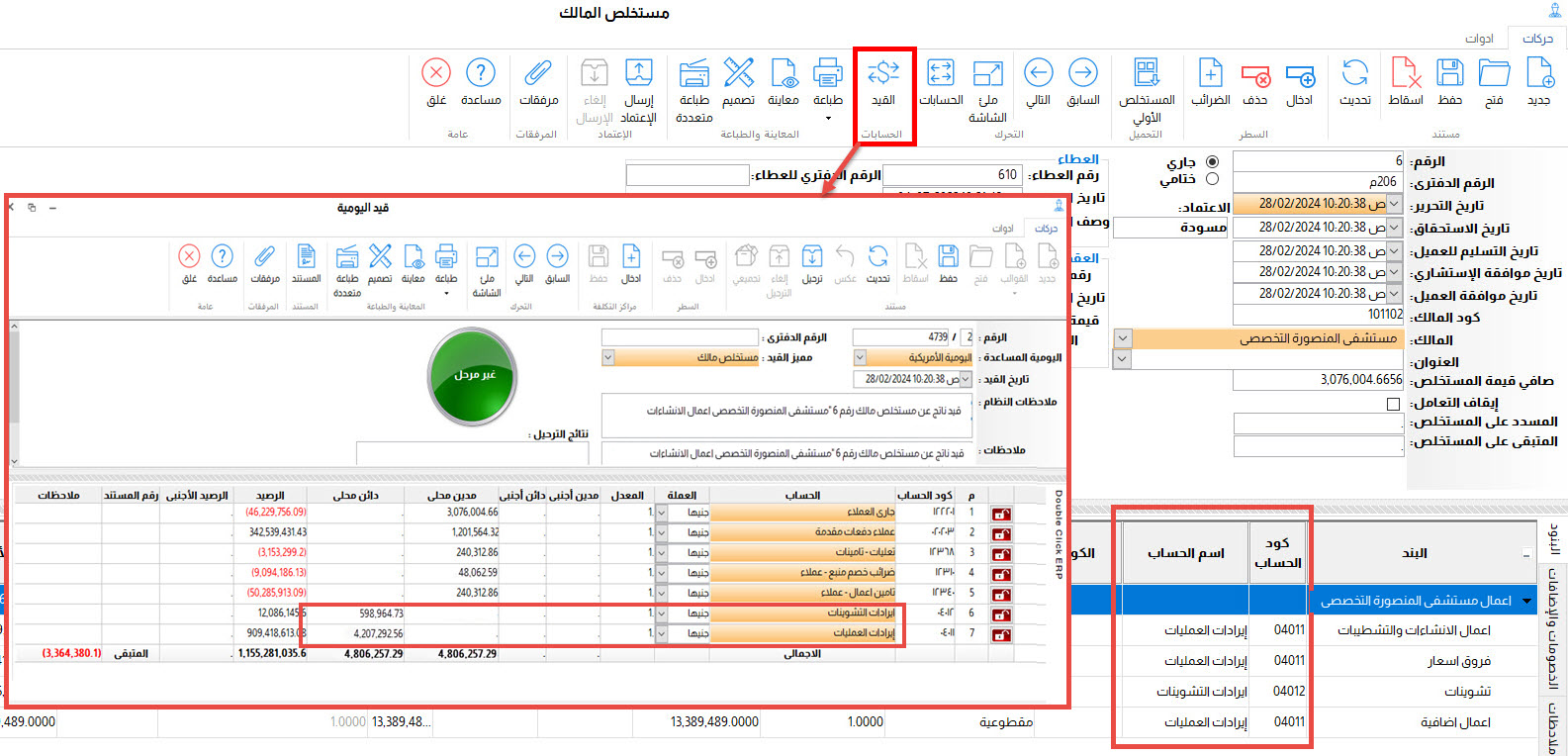 وذلك بامكانية تحديد حساب الايراد على مستوى السطر فى مستخلص المالك مع مراعاة ان الحساب الافتراضى سيكون حساب الايراد المحدد فى نوع العقد