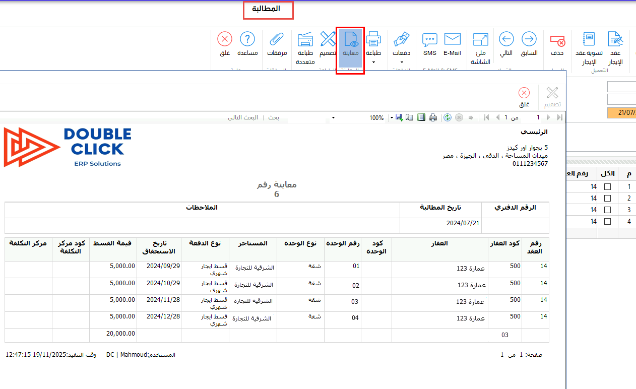 المطالبة على عقد الايجار هى المستند الذى يثبت استحقاق ايجار الشهر على المستأجر ، وتثبت زيادة مديوينة المستأجر تجاه الشركة لذلك هى احد المستندات الهامة والضرورية فى مجال الاستثمار العقارى ، وفى هذا الاصدار تم اعادة تصميم معاينة مطالبة عقد الايجار بواسطة تقنية SSRS لتسهيل التصميم و امكانية عمل تصميمات متعددة بأشكال مختلفة تناسب الاغراض المختلفة للمطالبة وحسب التصميم المرغوب فيه لكل مؤسسة .