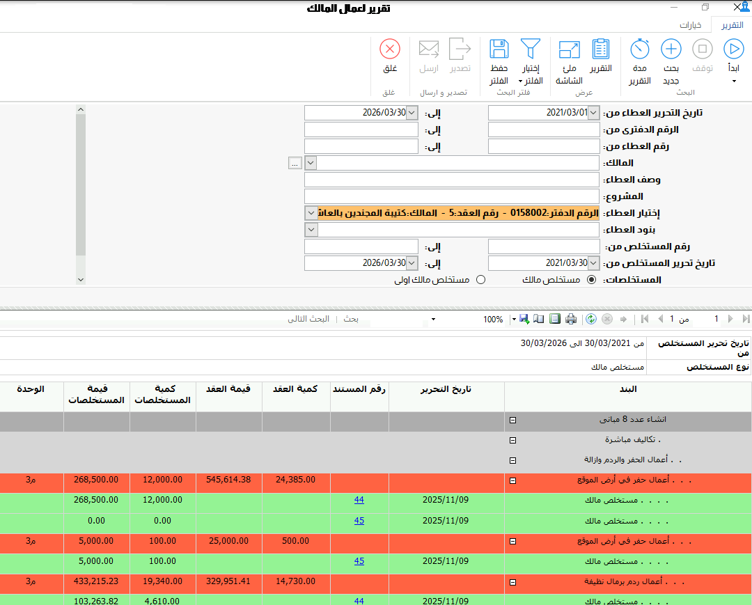 وبنائا على ماسبق تم فى هذا الاصدار من DOUBLE CLICK ERP اضافة تقرير جديد (اعمال المالك) والذى من خلاله يمكن حصر المستخلصات المقدمة للمالك على المشروع عن فترة معينة ، مع امكانية استعراض ذلك بشكل تحليلى على مستوى بنود الاعمال ، كما يمكن استعراض هذا التقرير على مستخلص المالك الاولى ، ومن خلال خاصية Drillthrough يمكن استعراض تفاصيل مستخلص معين من التقرير مباشرة