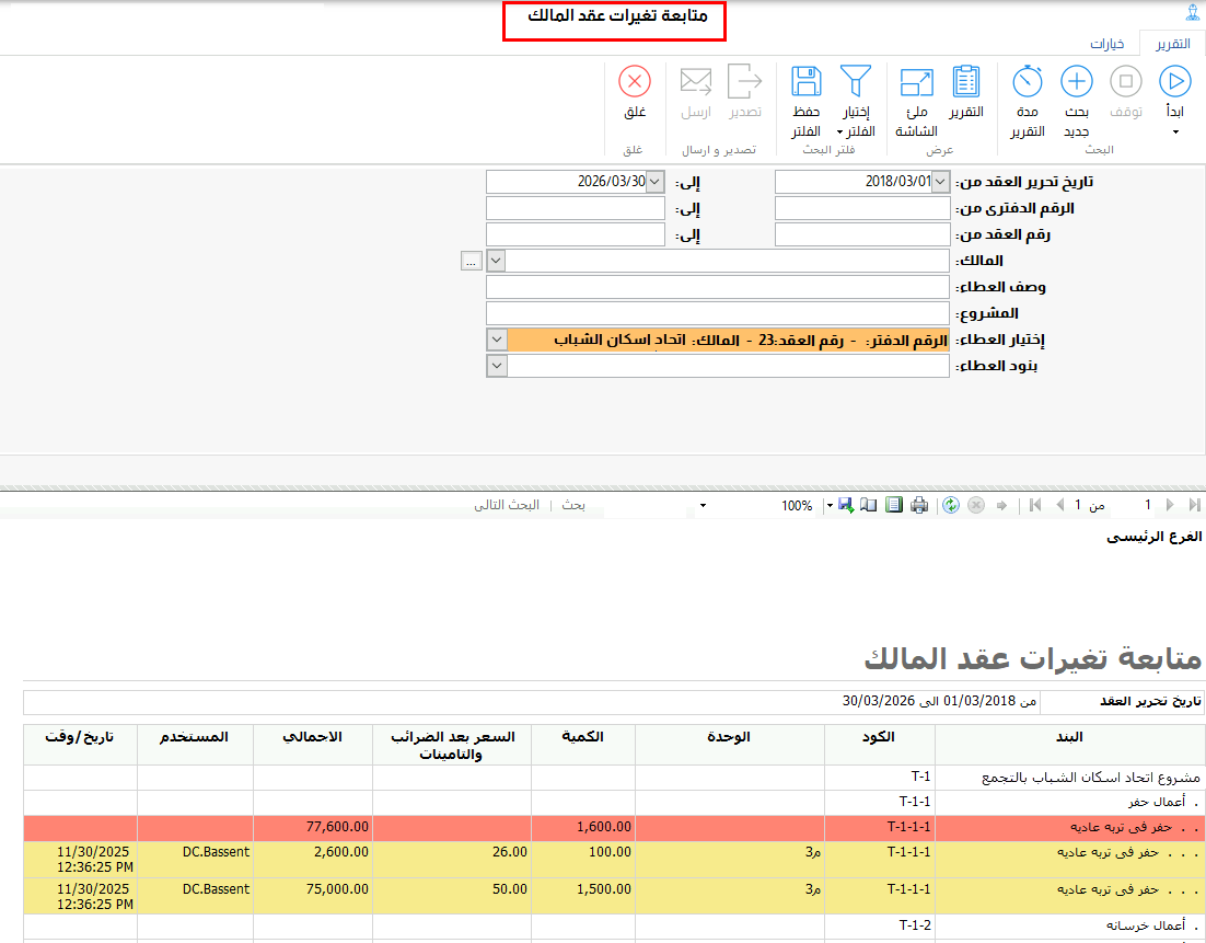 وحتى يسهل على المستخدم مراجعة ومتابعة البنود التى تم التعديل عليها ففى هذا الاصدار تم انشاء تقربر لحصر بنود الاعمال التى تم تغييرها والتغيرات التى تمت عليها سواء كانت تغييرات فى السعر او فى الكمية وكذلك يوضح المستخدم الذى قام بهذه التغييرات ووقتها .