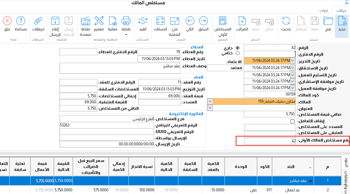 فى مستخلص المالك تم اضافة عمود باسم (رقم مستخلص مالك اولى) المحمل منه