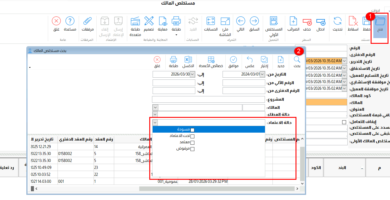 فى شاشة مستخلص مالك اولى > فتح (شاشة البحث)