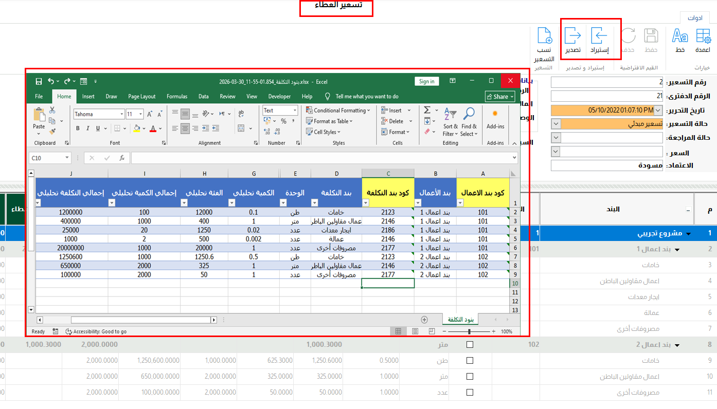 بسبب ضخامة حجم بنود الاعمال وما تحتها من بنود تكلفة فقد تم اضافة امكانية تسعير المشروع من خلال الاستيراد من ملف اكسيل كما يمكنك تصدير تسعير محفوظ مسبقا ثم اعادة استيراده لتسهيل اضافة وتعديل الكميات والتكلفة وبنود التكلفة .