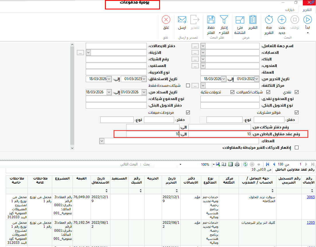 وفى هذا الاصدار تم تسهيل حصر المدفوعات لمقاول الباطن حسب العقد المبرم بين الشركة ومقاول الباطن ، فقد تم اضافة امكانية البحث برقم عقد مقاول الباطن فى تقرير يومية المدفوعات لحصر المدفوعات على عقد معين ، كما تم اضافة عمود برقم العقد ليكون متاح اضافته عن طريق التصميم حسب الحاجة لذلك.