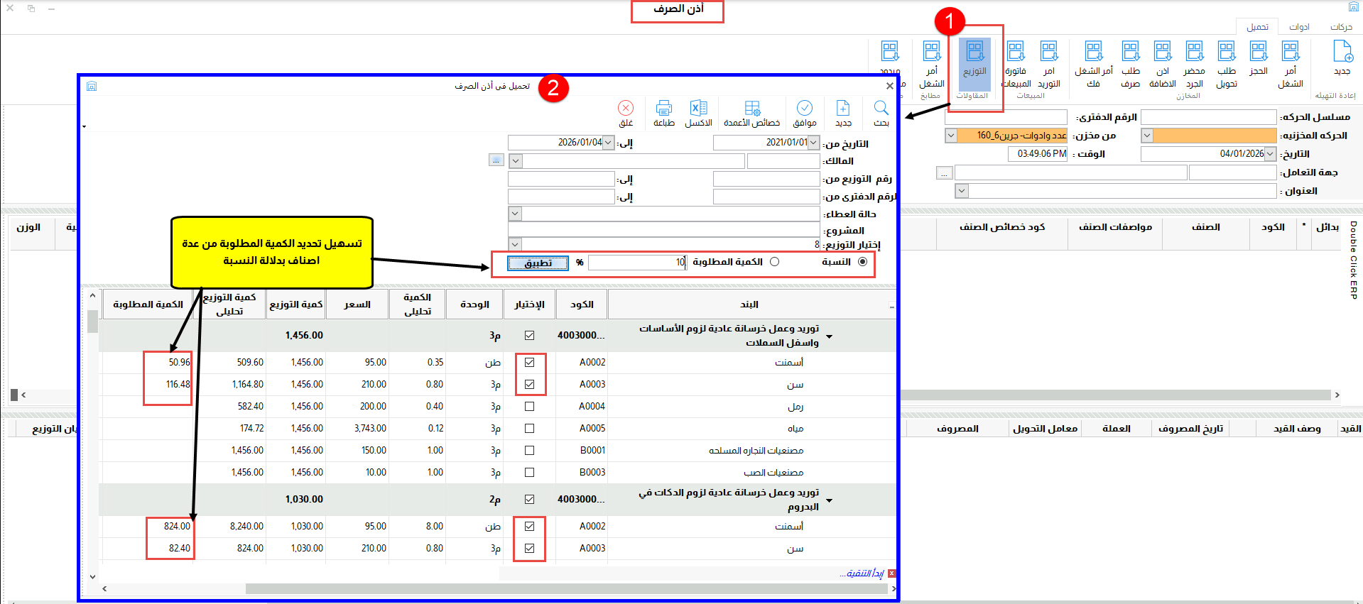 كل هذه الخصائص ادى الى ضرورة تسهيل العمل على برنامج المقاولات فى جميع مراحل العمل على المشروع وهو ما يحققه برنامج المقاولات ، وفى هذا السياق تم فى هذا الاصدار من DOUBLE CLICK ERP اضافة ميزة جديدة تسهل على المستخدم تحديد الكمية المطلوب صرفها او شرائها على المشروع من خلال تحديد البنود المطلوب الصرف عليها ثم تطبيق الكمية المطلوب صرفها على هذه البنود من خلال ادخال نسبة او كمية محددة .