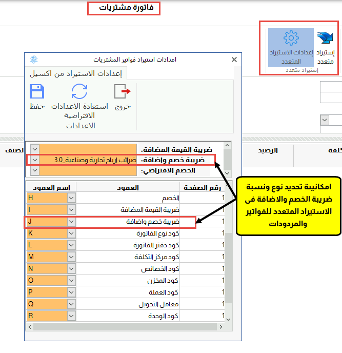 لذلك تم تطوير هذه الجزئية بامكانية تحديد ضريبة الخصم والاضافة فى ملف الاستيراد المتعدد الخاص بالمستندات التالية